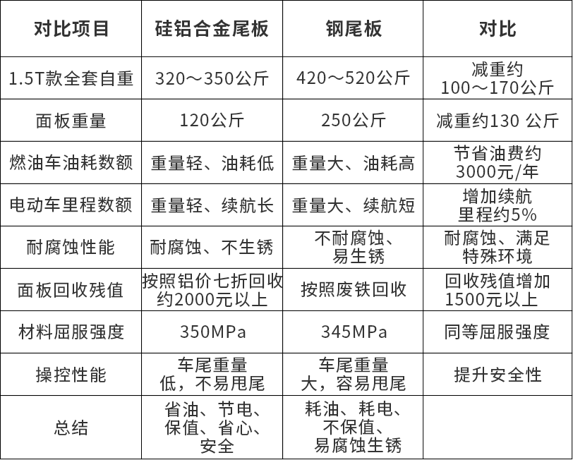 硅鋁合金尾板與常規(guī)鋼尾板性能對(duì)比如下: